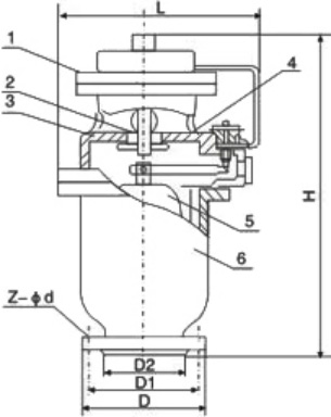 尼科全压高速排气阀由下阀体,中阀体,浮筒,浮筒杆,阀芯,盖板,活塞杆,膜片及阀盖等组成的全压高速排气阀,其特征是通过销轴与浮筒铰接的浮筒杆可绕主轴转动,并由此实现通过浮筒升降控制阀芯的升降启闭,即当浮筒下降(阀体里充满气体)时,阀芯上升,打开小阀口,并关闭小排气帽上的排气口,使气体通过导管进入液压罐内,当浮筒在浮力作用下上升时候,阀芯下降,关闭小阀口,同时打开排气帽上的排气口,使液压罐通过导管,直通大气泄压,且当浮筒下降,液压缸内充满气体时,阀门上的大排气口自动关闭。当水泵停止,管内水流空时或遇到管内产生负压时,吸入空气,确保管线安全。