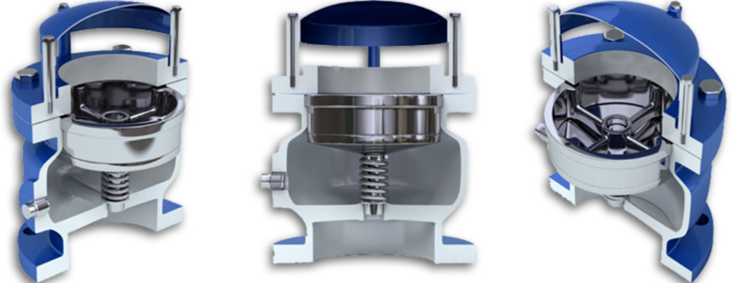 消除断流弥合水锤真空破坏与微量排气复合阀:当水柱分离时,可高速吸气,破坏真空;当断流 弥合时不高速排气,气囊起缓冲作用,但可微量排气,逐渐排除积存的空气。