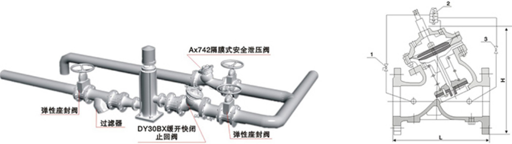 缓开快闭止回阀采用双室驱动装置,Y型结构。介质在定向运动中具有半直线水流,过流量较大,压力损失小,启闭运行平稳、不产生压力波动等优点。双室驱动装置可作为一个整体拆卸,便于检查,膜片采用尼龙强化橡胶制成,合用寿命长,阀瓣密封件可拆卸,维修更方便。