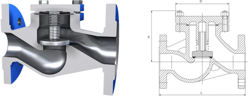 尼科H41H铸钢升降式法兰止回阀是能自动阻止流体倒流的阀门,止回阀的阀瓣在流体压力作用下开启,流体从尼科侧流向出口侧;当尼科侧压力低于出口侧时,阀瓣在流体压差、本身重力等因素作用下自动关闭以防止流体倒流。专用于控制腐蚀性或强腐蚀性介质,阀体内腔表面覆有可供选择的各种氟塑料,具有强度高、耐腐蚀性能好的特点,适用于不同工作温度和流体管路,防止各类管路或设备上的介质逆流的单向阀。升降式止回阀只能安装在水平管道上。