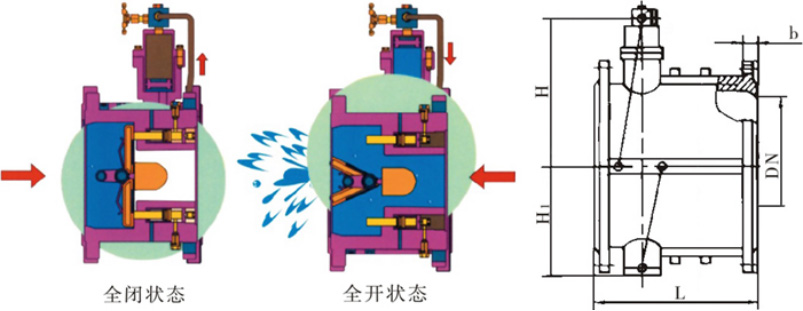 尼科HH49X微阻缓闭蝶式止回阀原理为依靠尼科介质的推力作用,将两块阀瓣平稳推开;在此同时,尼科的压力介质进入油缸内活塞的下部,推动活塞,将活塞上部的油通过针型阀分别压入阀体两侧的小气缸尾端,使小气缸内的活塞杆伸出。当尼科介质压力下降低于出口压力时,介质将产生回流,此时阀瓣在弹簧和介质回流的作用下,将自动关闭。但由于活塞杆处于伸出的位置,顶住阀瓣不能全部关闭,还剩有20%左右的面积使介质通过,从而起到了消除水锤的作用。阀瓣被活塞分成先快速关闭后缓慢两步关闭,达到既防电机逆转又起消除静音作用。