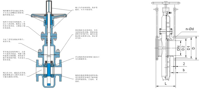 ①平板闸阀有二个浮动阀座,每个阀座都设计成两个方向介质流动时均能密封,因此平板闸阀不但能实现双向密封而且能实现进出口同时密封,阀座采用"O"型密封圈密封和弹簧施加预紧力的浮动阀座结构,当阀门受热膨胀并造成中腔的压力大于管道的压力时,介质作用在阀座两边的压力差将把浮动阀座推离闸板,使中腔压力通过闸板与阀座间的间隙泄放到管线中,从而有效的保护了阀门的安全,并且该结构的启闭力矩公为普通阀门的1/2,能达到轻松开、关阀门;