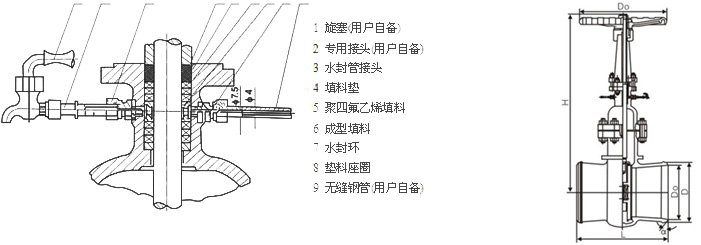 ①水封闸阀的阀盖填料室具有水密封结构,当接口通入压力0.6~1MPa的水时,可使系统与大气隔离,保证系统具有良好的气密封;