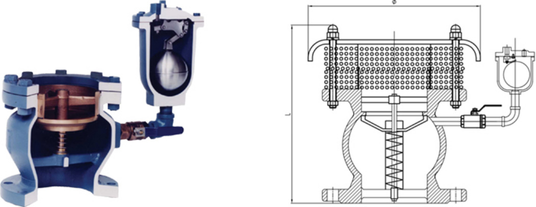 消除断流弥合水锤真空破坏与微量排气复合阀:当水柱分离时,可高速吸气,破坏真空;当断流 弥合时不高速排气,气囊起缓冲作用,但可微量排气,逐渐排除积存的空气。