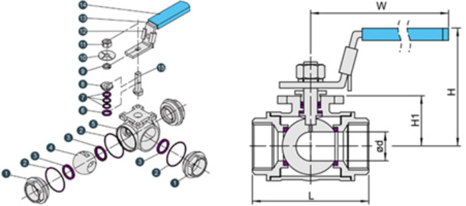尼科T型/L型螺纹三通球阀结构: